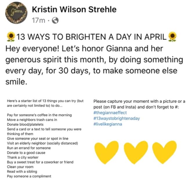 or perform your own acts of service with a smile on your face and Gianna in your heart. 💛
